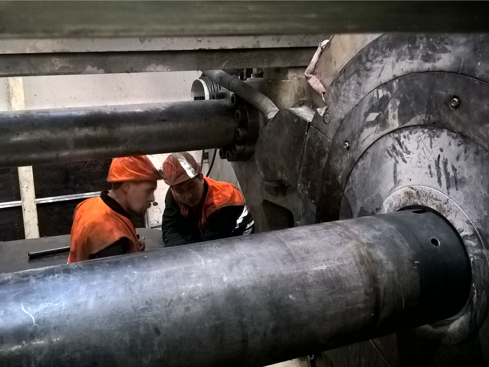 További igényes és pontos munkánk volt a gép egytengelyűségének beállítása. A legfontosabb a gép présfejének és recipiensének továbbá szerszámának tengelybe állítása. Ezt a munkát megrendelőnk utasításai alapján végeztük. Sokan nem gondolnák, de az ilyen nagy présgépeket is (a szóban forgó gép 4400 tonna préselőerővel rendelkezik) tizedmilliméter pontossággal állítják be.